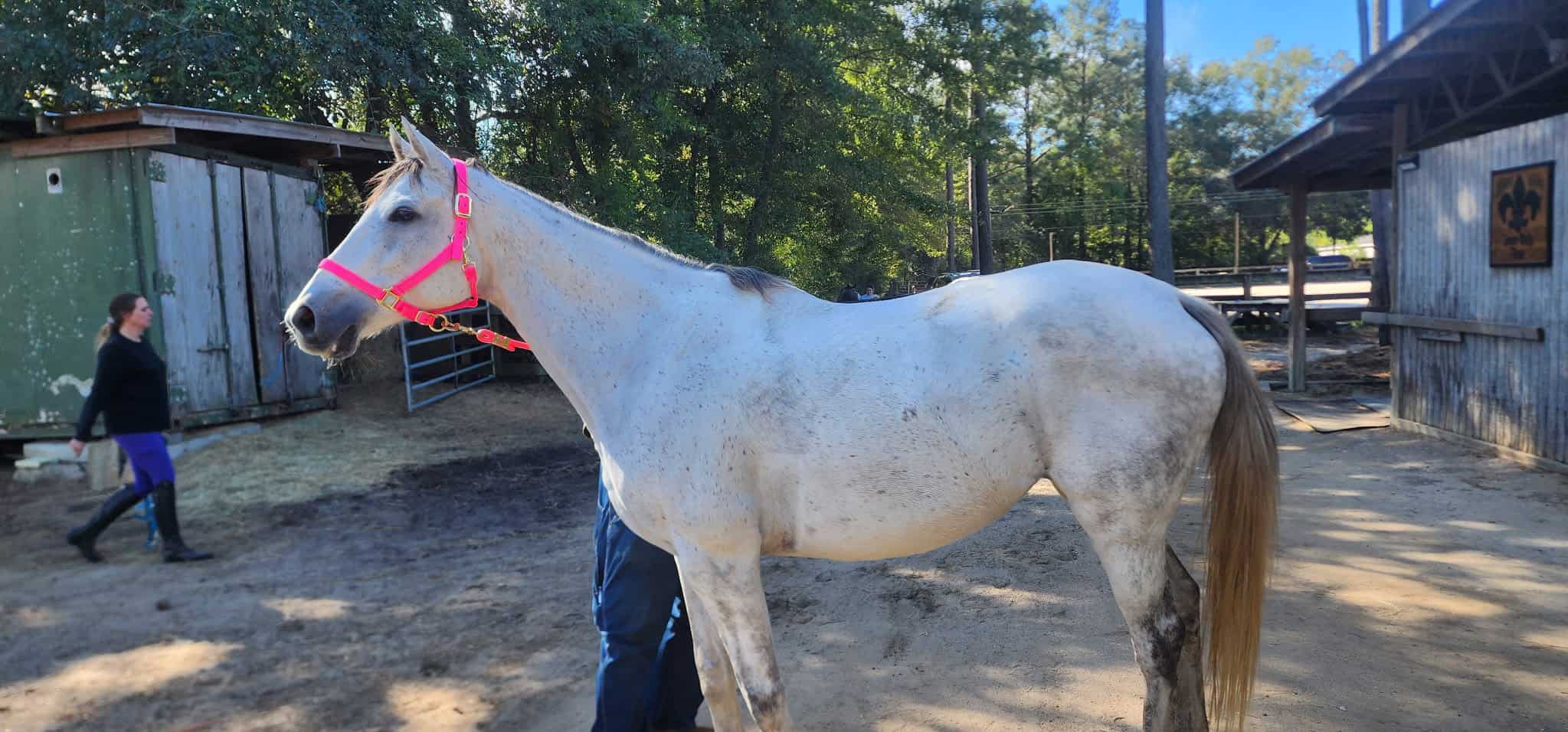 With light maintenance typical of an OTTB, Tap does best with consistency and thoughtful care. She maintains her condition easily through balanced nutrition and regular turnout. As she continues to build muscle and experience, her gentle temperament and cooperative attitude make her a pleasure to handle and bring along.